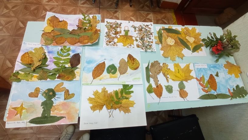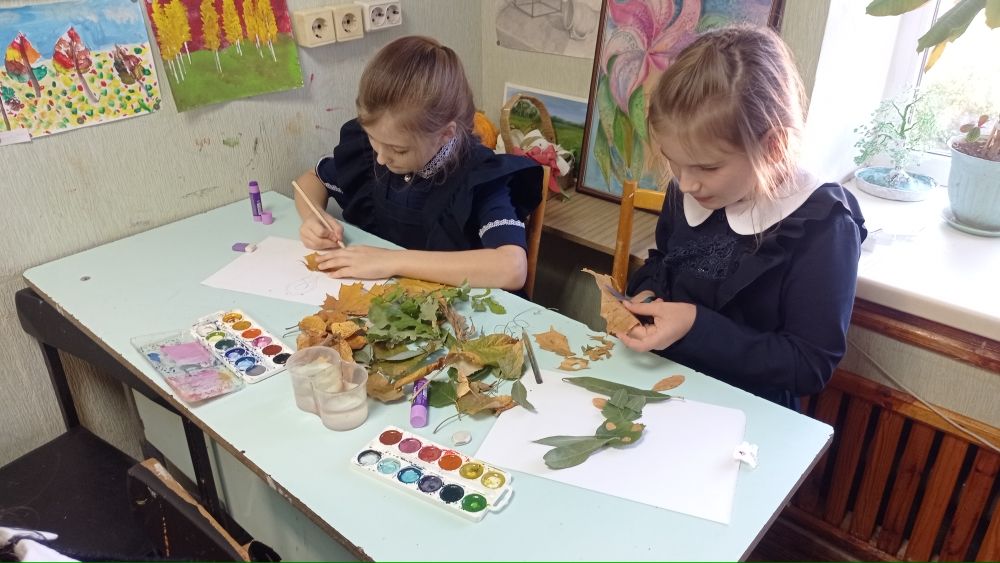 На занятии декоративно-прикладного искусства обучающиеся познакомились с новой техникой коллажа. Учащиеся с помощью клея приклеивали к листу бумаги осенние листья, которые они собрали в Парке или на улице. Преподаватель Ельцева Анна Александровна показала и рассказала, как сделать из листьев фантазийное дерево на бумаге.
