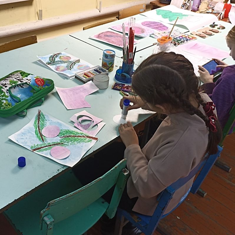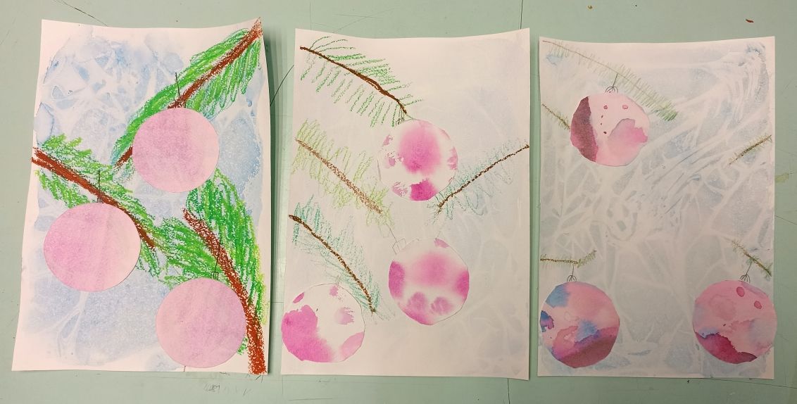 Одним из главных атрибутов для украшения новогодней ёлки являются игрушки. Существуют различные виды украшений, одними из которых являются шарики. Вместе с преподавателем Ялышевой М.М. ребята выполнили аппликацию с ёлочными шариками, выполненную в смешанной технике с использованием акварели и восковых мелков.