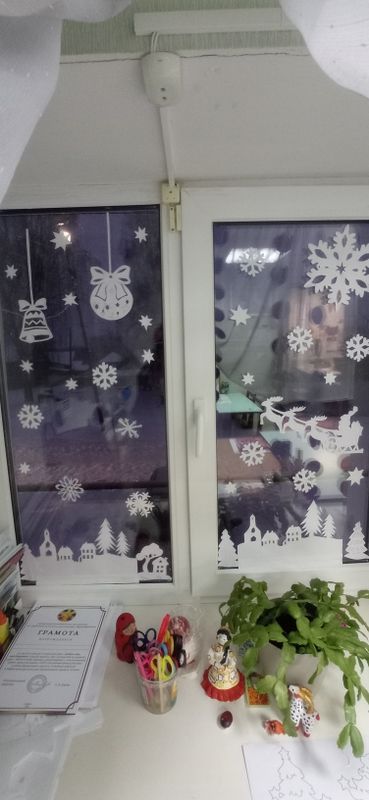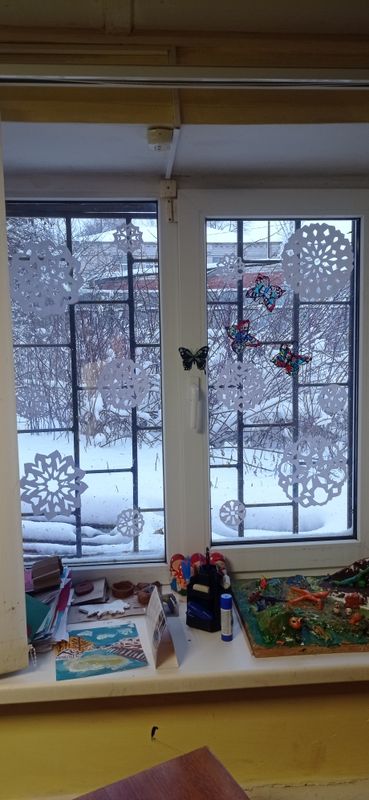 В нашей школе прошла акция "Новогодние окна". Учащиеся совместно с преподавателями украсили окна новогодними картинками и снежинками из бумаги.